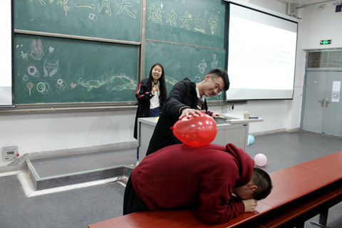 第一个游戏的名字叫做《温馨卡片传递真情》。这个游戏是由女生们自由选择气球,气球里面是我们学院的男生为女生节的到来而给女生们精心准备的小纸条,内容不仅有男生们对女生们的节日祝福,也有一些恶搞的小游戏,如果是祝福呢就由选到的女生大声读出来,小游戏的话就由大家一起配合她去完成。