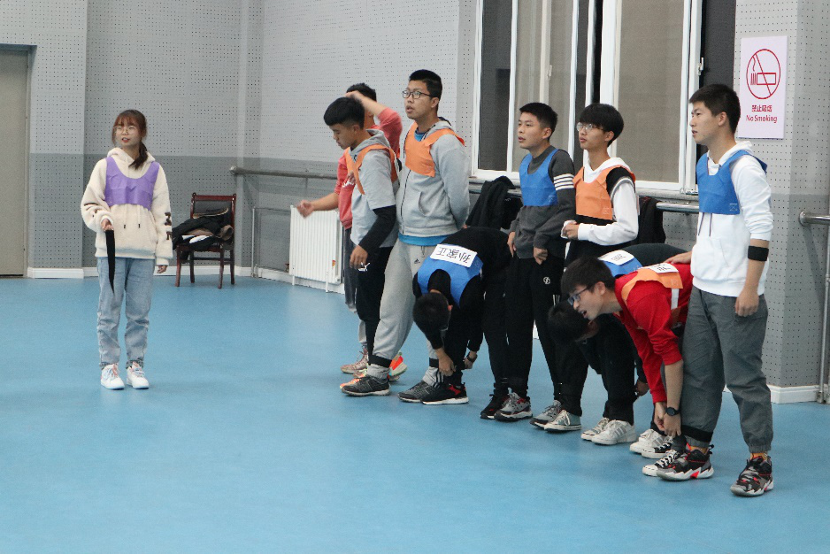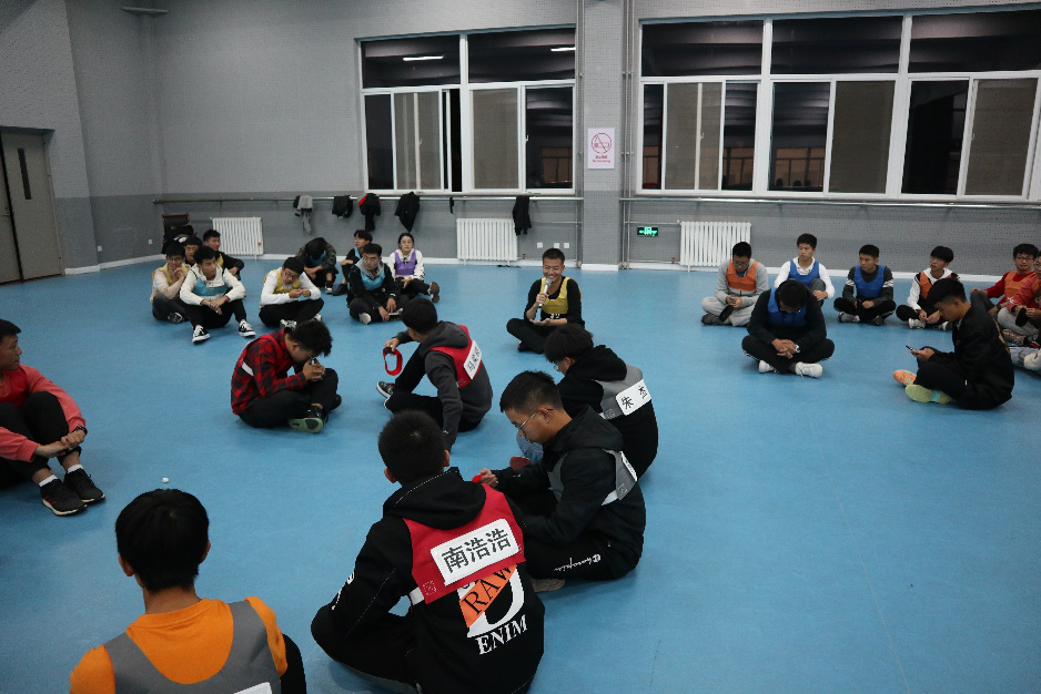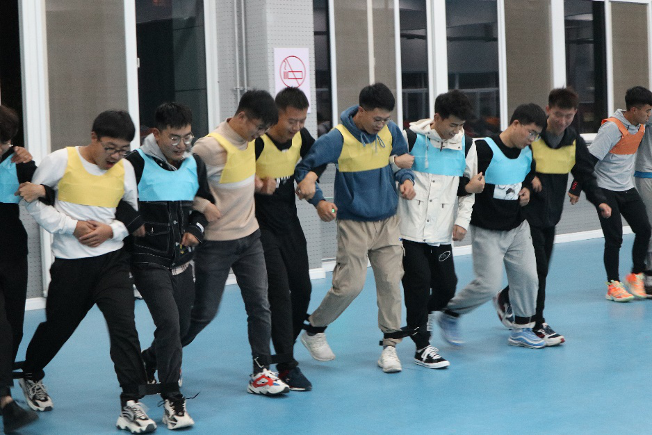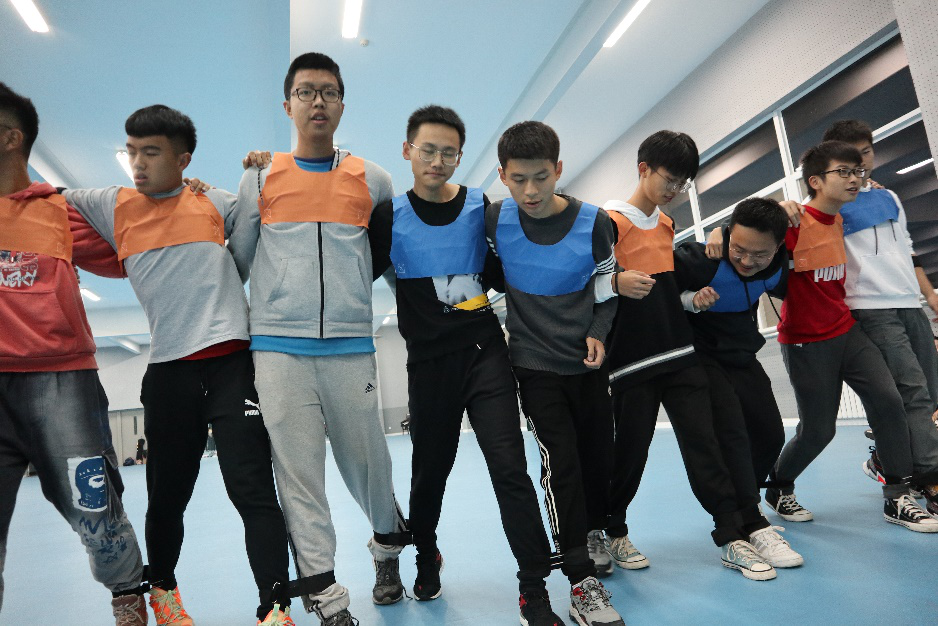 按照计划,同学们和队友相互沟通,制定好行进口令。一开始大家都跌跌撞撞的,遇到许多问题:步调不一致,每个人跨步距离不同,失败多次后积极交流并总结出经验,终于可以安心的迈出脚步,共同前进。