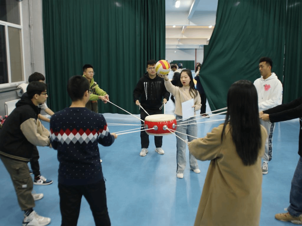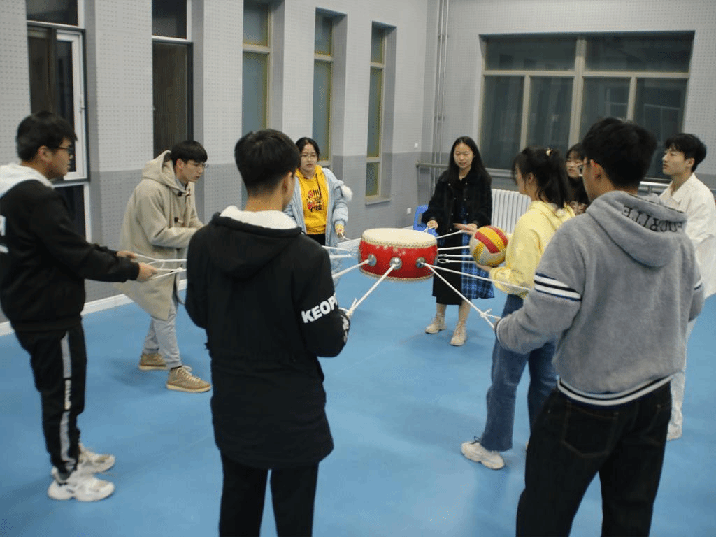鼓舞飞扬游戏规则:每队8人,裁判工作人员负责放置球,其余队员手持鼓上的绳子,
