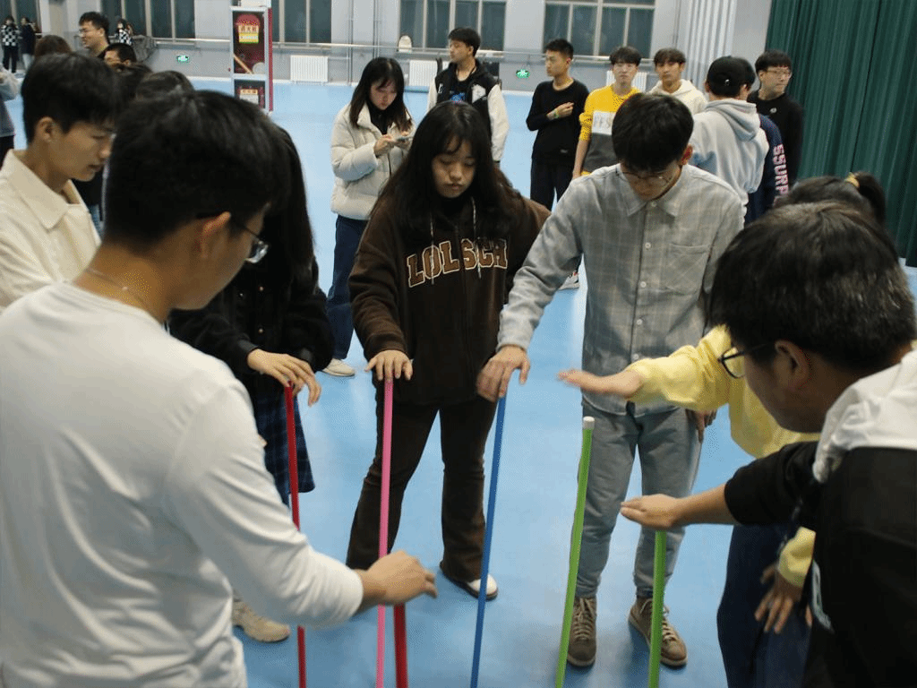 不倒森林游戏规则:每组8人参赛,围成一个圆圈;比赛开始前每人由手掌心按压塑料桩。听到开始信号后,顺时针跑动,人动桩不动,如此往复,直至第一位队员回到首次持桩点为结束。PS:如果有一个桩倒地,那么将重新开始!只见六组组员围起来开始转圈圈,