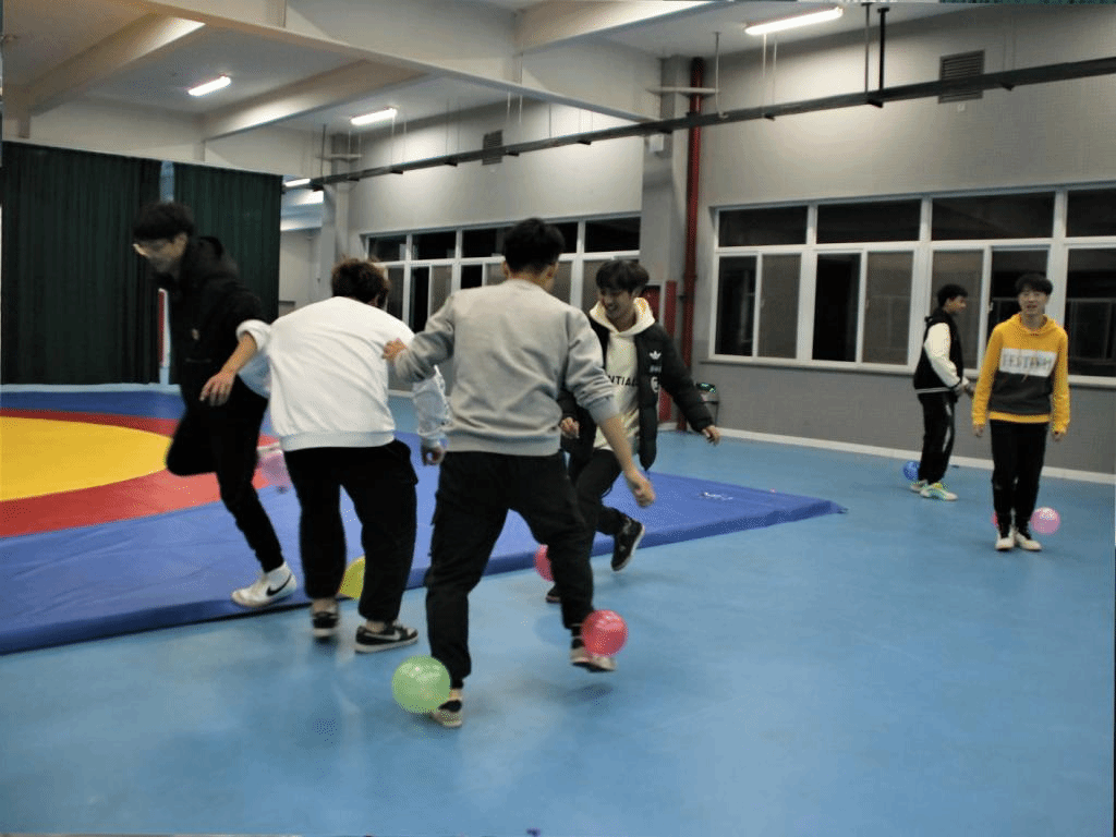 游戏规则:每组派出一个代表听令抢气球,抢到的同学比赛吹气球,哪组率先将气球吹爆会派进行表演并获得相应分数。