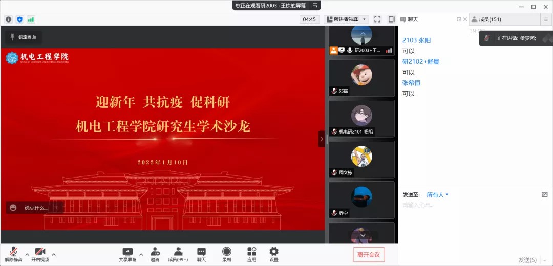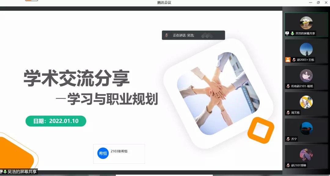 西安新冠肺炎疫情突如其来,广大同学同心共抗新冠疫情,积极配合防疫政策,响应“停课不停学”号召。为了进一步营造我院研究生的学术氛围,更好的展示广大研究生的科研成果,促进研究生的相互交流与学习。按照《机电学院关于新冠肺炎疫情防控期间研究生培养工作的安排》的具体安排,雷竞技RAYBET于1月10日19:00开展了第三期研究生线上学术沙龙。本场活动邀请2020级硕士研究生刘锋伟,2019级硕士研究生吴浩、张梦芮,针对同学们关注的学习方法与职业生涯规划方面展开交流分享。