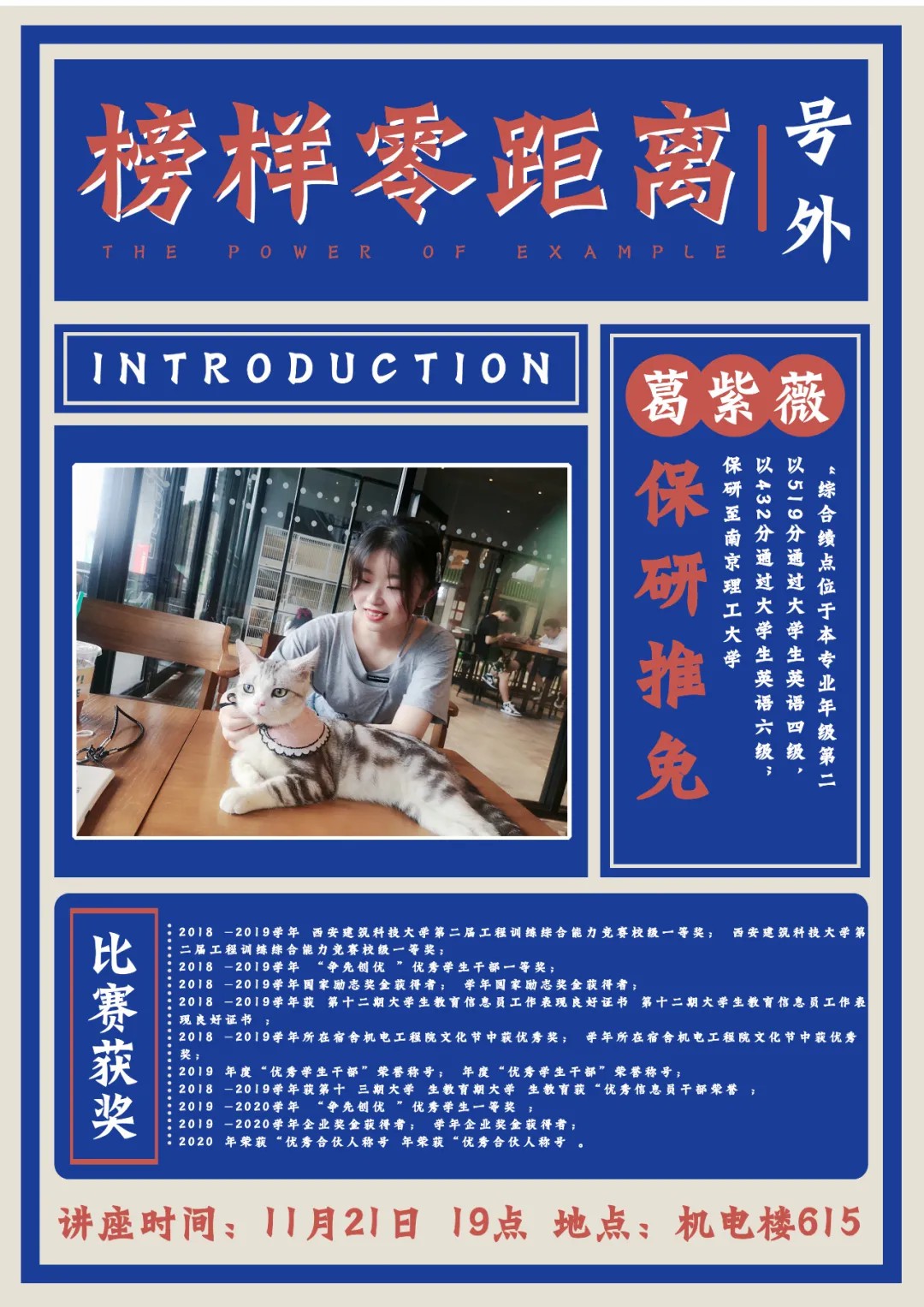 葛紫薇,女,机械设计制造及其自动化1801班学生。综合绩点位于本专业年级第二,以519分通过大学英语四级,以432分通过大学英语六级,保研至南京理工大学。在校学习期间荣获多项荣誉。