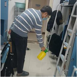疫情防控不留死角,“机电小齿轮”坚持定期定时对宿舍区域进行卫生检查、消毒消杀,排除宿舍安全隐患。消杀过程中,工作人员严格按照卫生消毒管理的标准规范,手握喷壶,对各个寝室逐一进行了全面细致的消杀作业,确保不留死角,全方位覆盖,保证寝室的每一处地方都得到了有效的卫生消杀,起到了很好的消毒效果。