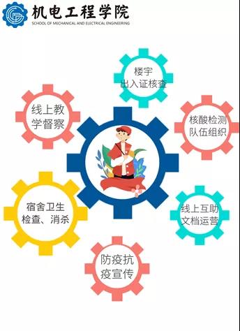 面对突如其来的疫情,机电学院上下一心,精诚团结,号召广大同学熟知、遵守配合防疫相关政策。同时,学生群体中组建了“机电小齿轮”志愿服务队伍,加强疫情期间的自我管理能力,在疫情防控关键时期站得出来、冲得上去!为抗击疫情贡献青春力量。“机电小齿轮”志愿服务氛围五个队伍,分别为宿舍卫生检查、消杀组,线上教学督察组,楼宇出入证核查组,核酸检测维稳组,防疫抗疫宣传组,线上互助文档运营组。