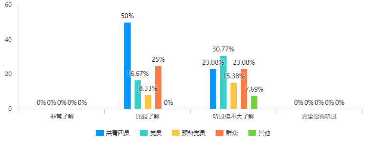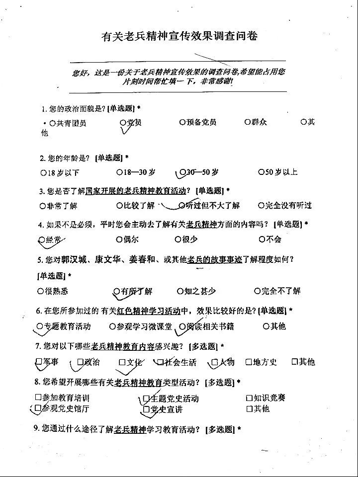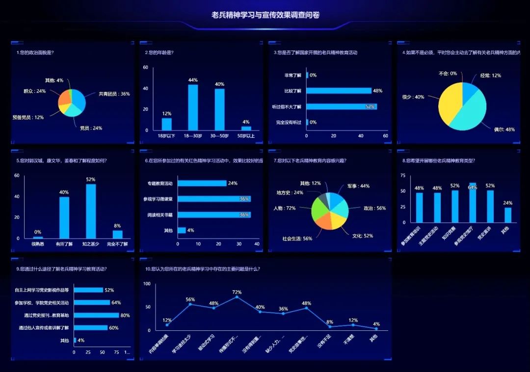 本次问卷调查采用线下调查,根据大数据分析结果,总体来看,大家对老兵精神的了解情况处于“比较了解”和“听过但不完全了解“,两种状态。从政治面貌来看,党员、预备党员和共青团员对于老兵精神了解情况较好。年龄组成上,年轻一代对于老兵精神了解情况较好,而且,对于老兵精神的了解程度与年龄成反比,年龄越大,对于老兵精神反而了解越少。而在对老兵精神了解的意愿上,反而是中年人对于老兵精神的热情度较高。
