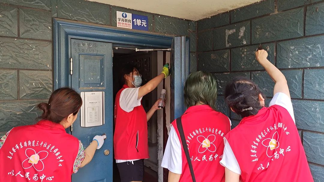 实践团来到居委会,首先参加了社区居委会的会议。在会议上,社区书记指出社区近期的主要工作,主要问题及解决方案后,便向实践团交代了上午的任务:清理老旧居民楼楼道内的小广告。这段时间社区的工作主要围绕创建全国文明城市展开,创城工作中重要的一环便是整洁的社区楼道。实践团便和街道办事处的各位工作人员一起拿着工具出发了。这段时间经过文明倡导和宣传,张贴小广告的现象有了明显改善,但老旧小区的楼道中的小广告仍未被清理干净。借着参加此次志愿活动,实践团跟随基层工作者一起为家乡献出一份自己的力量。