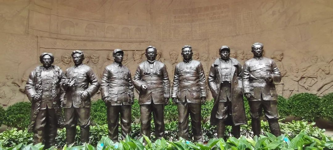 纪念馆入口处铜像,雕塑左到右依次为谢子长、刘志丹、高岗、林伯渠、习仲勋、彭德怀、贺龙