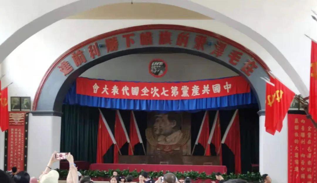 现在礼堂大厅内部是按七大会场原貌布置的。主席台正中竖立着毛泽东和朱德的画像。主席台上方横额“在毛泽东的旗帜下胜利前进”是大会的政治口号。后面墙上的题字“同心同德”是毛泽东的手书。