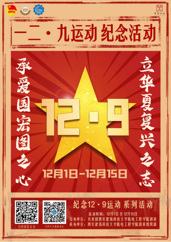 为了纪念一二•九运动和支持全校学风建设,弘扬爱国主义、营造良好校园学习氛围、活跃校园文化生活,“承爱国宏图之心,立华夏复兴之志”纪念一二•九运动系列活动就要来啦!