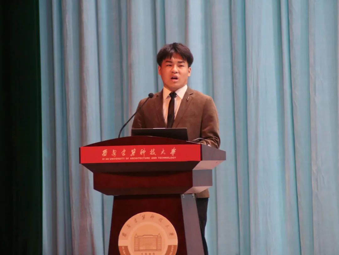 机制2101班王乐远同学代表新生发言。王乐远分享了初入建大的种种感受,树立了学习报国的远大志向,同时号召全体同学在大学生活中严谨自律,继续奋斗,为学院、为建大、为国家未来的发展贡献力量。