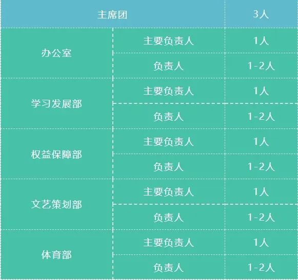 办公室、学习发展部、权益保障部、文艺策划部、体育部