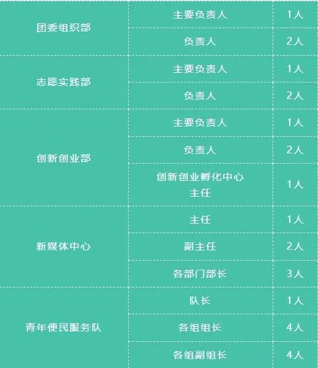 组织部、志愿实践部、创新创业部、新媒体中心、青年便民服务队