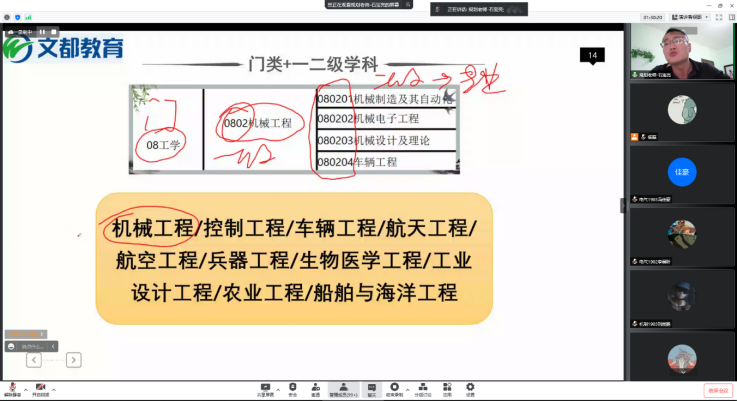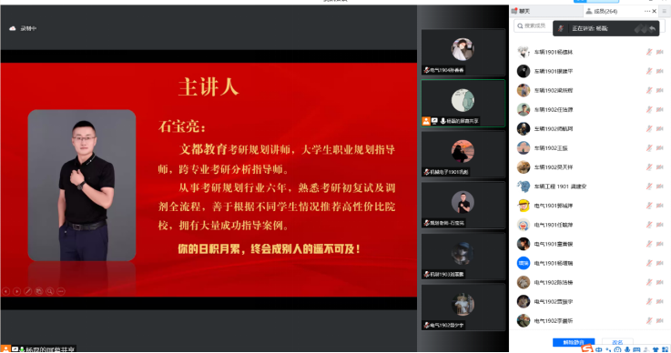 为了提高考研升学率与升学质量,深化学生对考研的理解,引导学生树立正确的考研目标,解答学生在备考过程中的疑惑,指导学生掌握正确的复习方法和节奏,熟悉考研报考流程,7月8日晚,雷竞技RAYBET联合文都教育举办线上考研规划分析指导会。院党委副书记贺伟、2019级辅导员孙浩以及2023届全体考研学生参加了此次大会,会议由2019级辅导员杨磊主持,文都教育考研规划讲师石宝亮应邀参加并担任主讲。