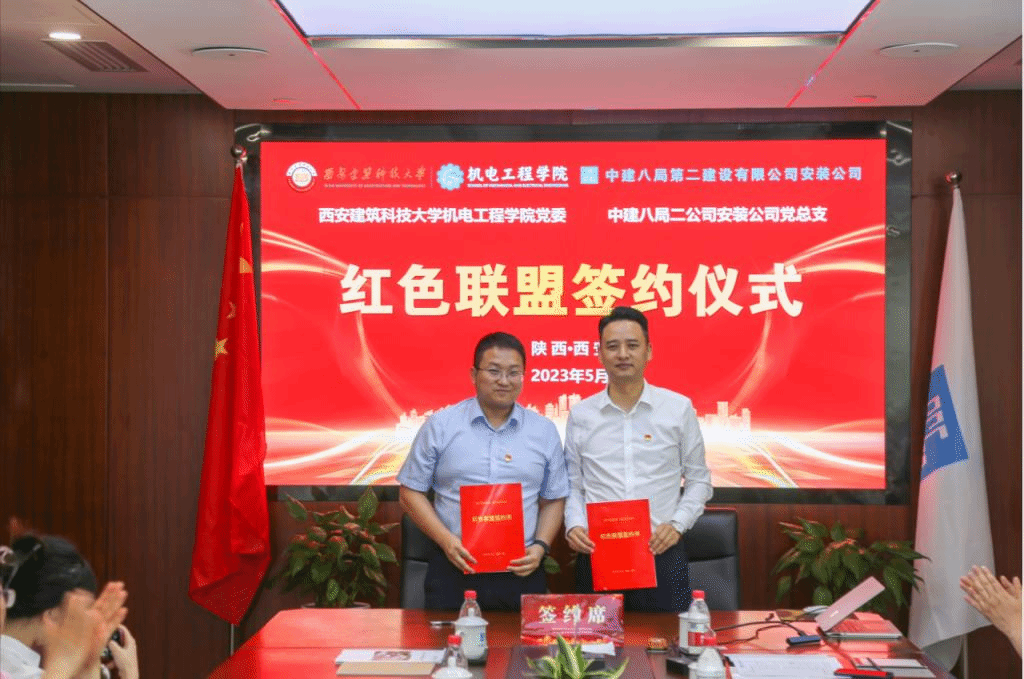 贺伟介绍了学院学科特色、学生就业创业的基本情况,希望校企两方加强联系、优势互补,深入推进联合科研攻关、行业标准制定、“红色联盟”党建联建、实习实训基地建设等校企合作项目。随后,贺伟与屈真签署了两方“红色联盟”党建联建合作协议,任延欢与安装公司总工程师胡杰签约揭牌了“大学生就业见习实习基地”。