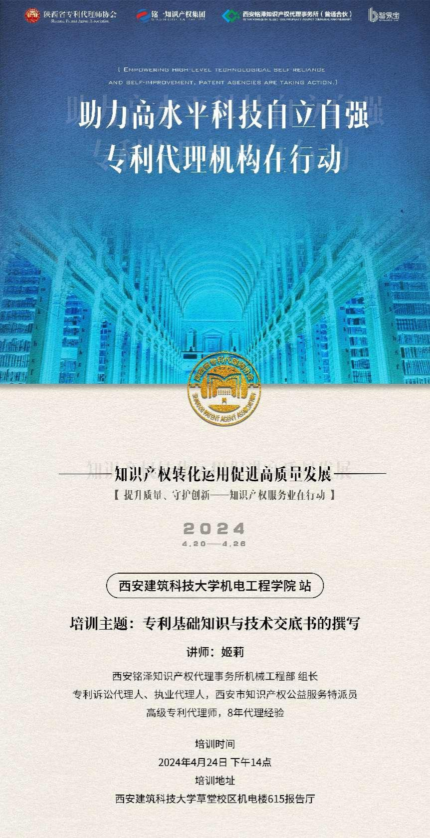为增强我院师生知识产权意识,进一步提升我校成果创新质量,促进知识产权转化运用高质量发展,4月24日,科技处特邀西安铭泽知识产权代理事务所机械工程部组长姬莉于机电楼615报告厅举办题为“专利基础知识与技术交底书的撰写”的报告会。