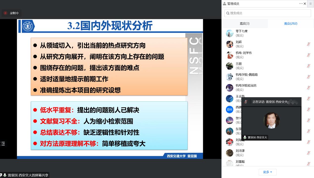 11月3日下午3点,西安交通大学教授、博士生导师雷亚国教授为我院师生做了题为“国家自然科学基金申报经验交流”的学术报告。我院拟申报2023年国家自然科学基金的教师、部分博士生、硕士生参加了本次学术报告会。报告由学院副院长李玲主持。