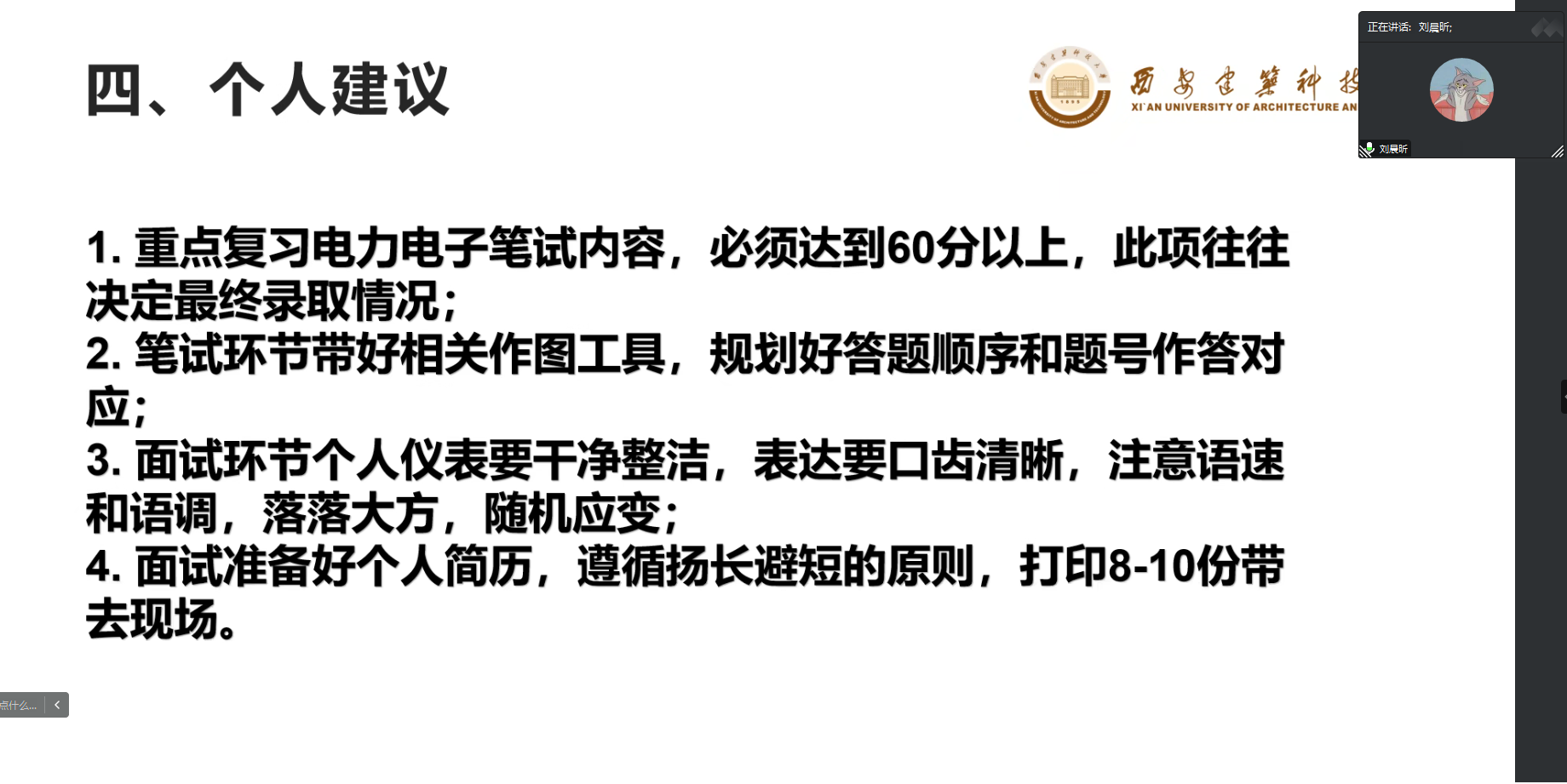 刘晨昕针对报考本校的同学,介绍了复试流程和笔试面试准备经验,分享了自身专业英语学习方法。他强调,专业课知识考察是复试过程中最重要的一环,必须扎实掌握专业课程基础,同时专业英语掌握程度也是面试老师们考察的重点,同学们必须注重专业英语的积累,为现场面试打好基础。