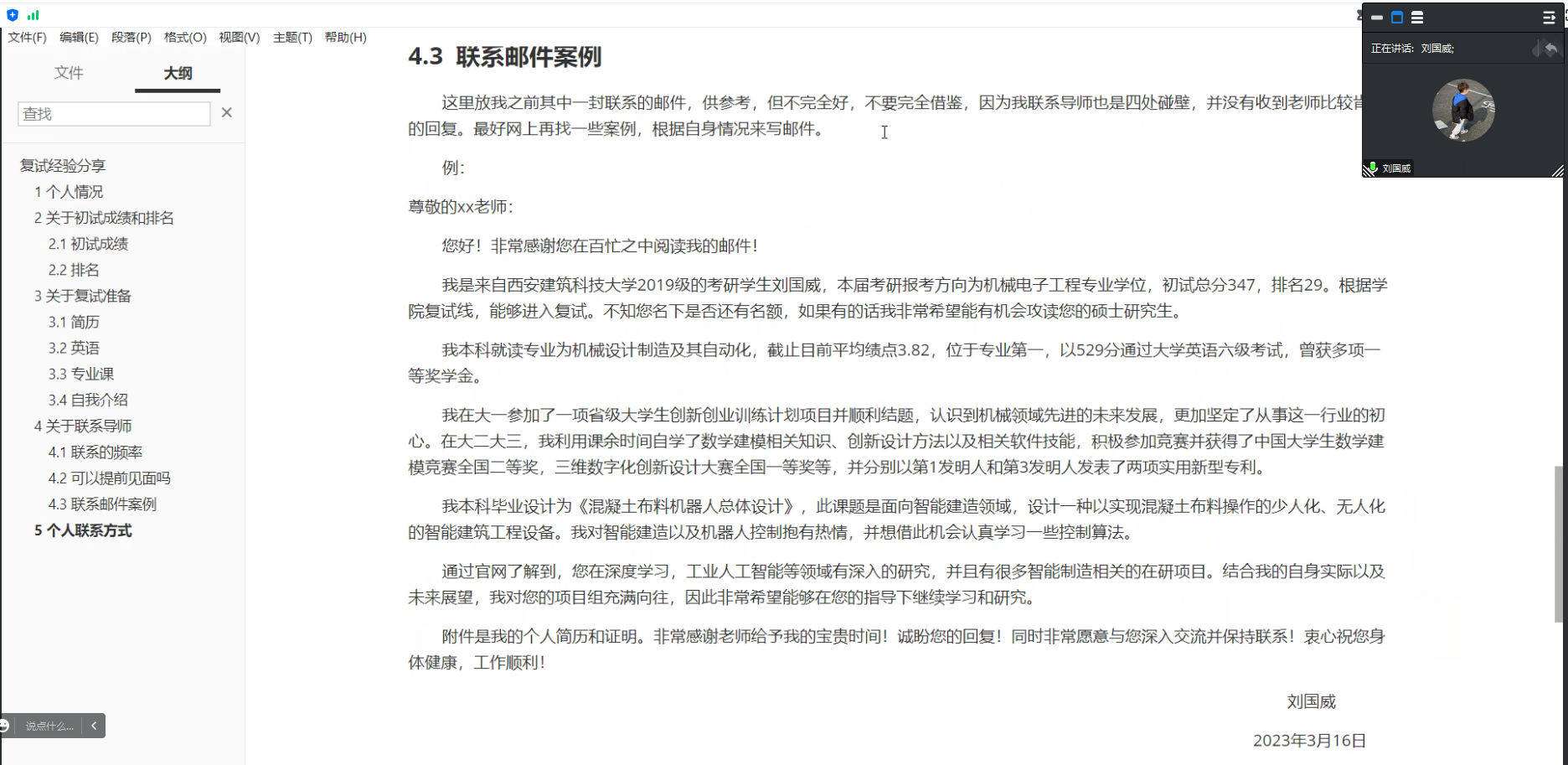 刘国威以自身经历为例,为各位同学分享了复试的前期准备经验,包括简历制作、导师查询等方面,重点介绍了应该如何联系导师,并分享了自己的邮件模板,供各位同学参考。