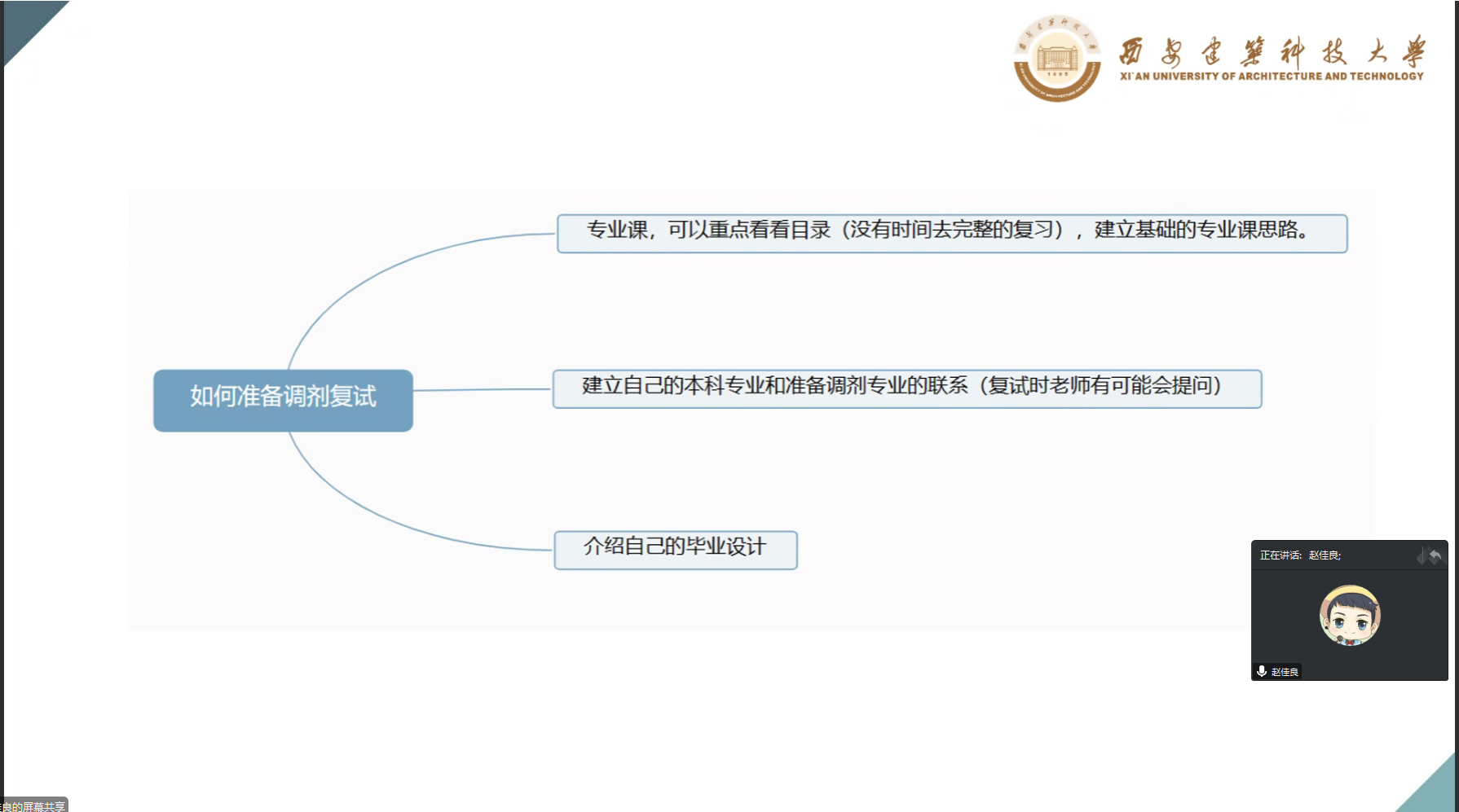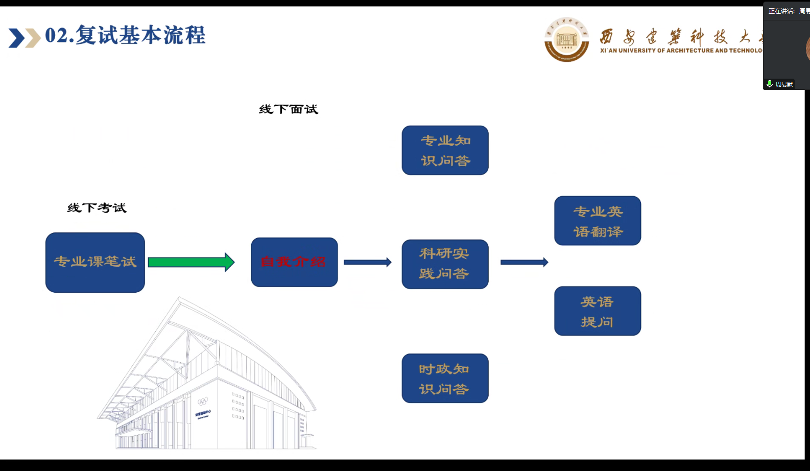 周易默对已分享的复试流程作补充说明,总结了复试过程中常见的疑难问题,梳理了专业知识重点及面试注意事项,鼓励大家积极应对复试,认真做好准备。