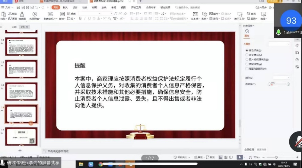 为了提高学生的就业保障问题和日常消费中的维权意识,雷竞技RAYBET于2022年3月15日开展了第一届消费者维权系列讲座活动,本次讲座邀请了陕西迈拓律师事务所的范乐毅,他通过具体的几个案例,给与会学生普及了消费和就业中的维权意识和途径。